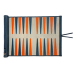 Handmade roll up backgammon, classically crafted using grained *parham leather in a range of covetable colour combinations. Simple leather ties fasten the game for traveling, which rolls out to reveal a sizeable playing field with leather points and a sumptuous suede lining. The board has a weighted leather-covered bar at the end to ensure it lies flat whilst playing – whilst at the opposite end, a zipped roll houses matching leather topped nickel counters and dice, making it an ideal travel game and very popular gift for all.